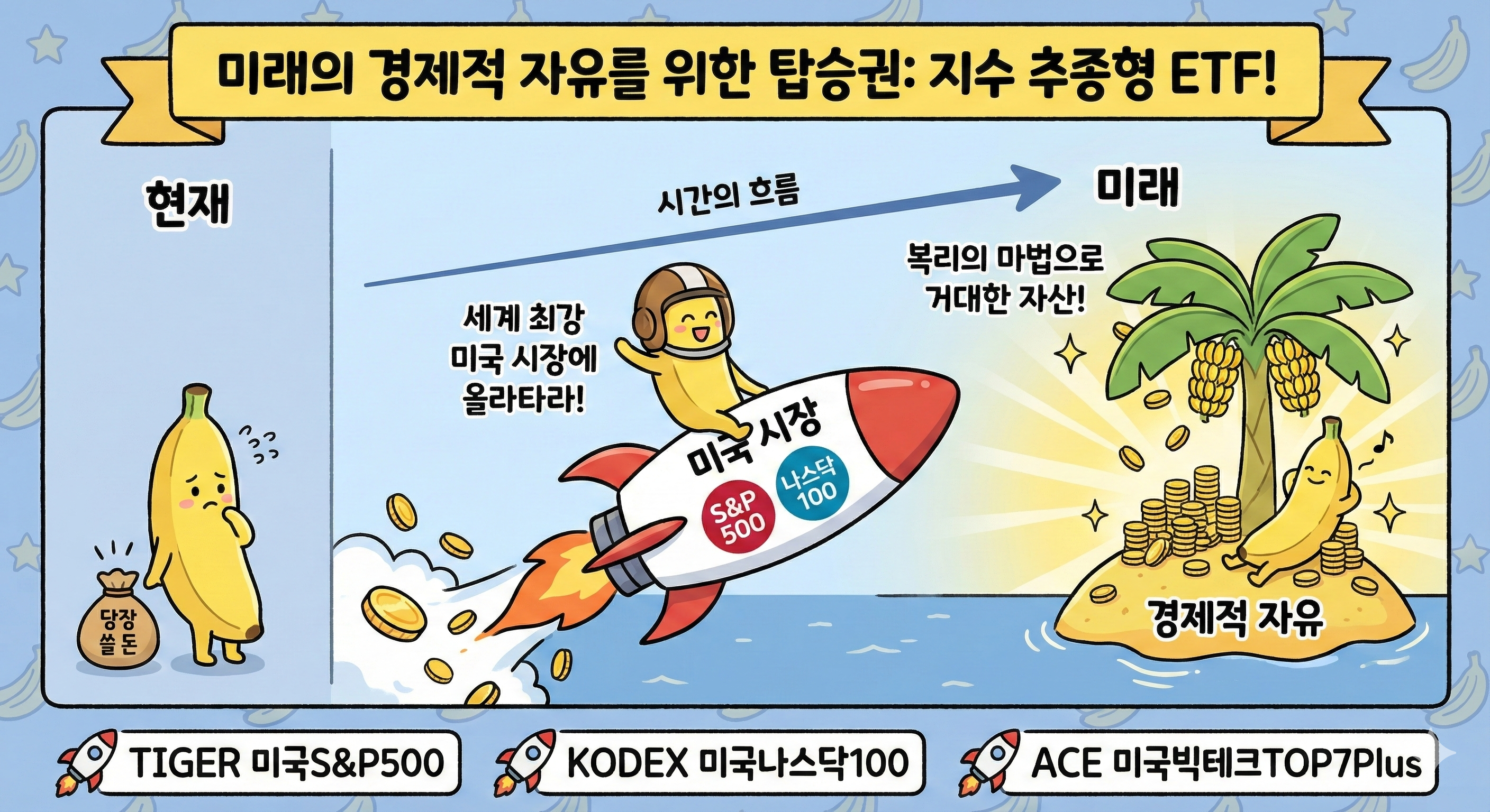 네가 당장 손에 쥐는 돈보다 먼 미래의 경제적 자유를 더 중요하게 생각한다면, 미국 시장의 거대한 흐름인 '지수 추종형'에 올라타 보는 걸 추천해.