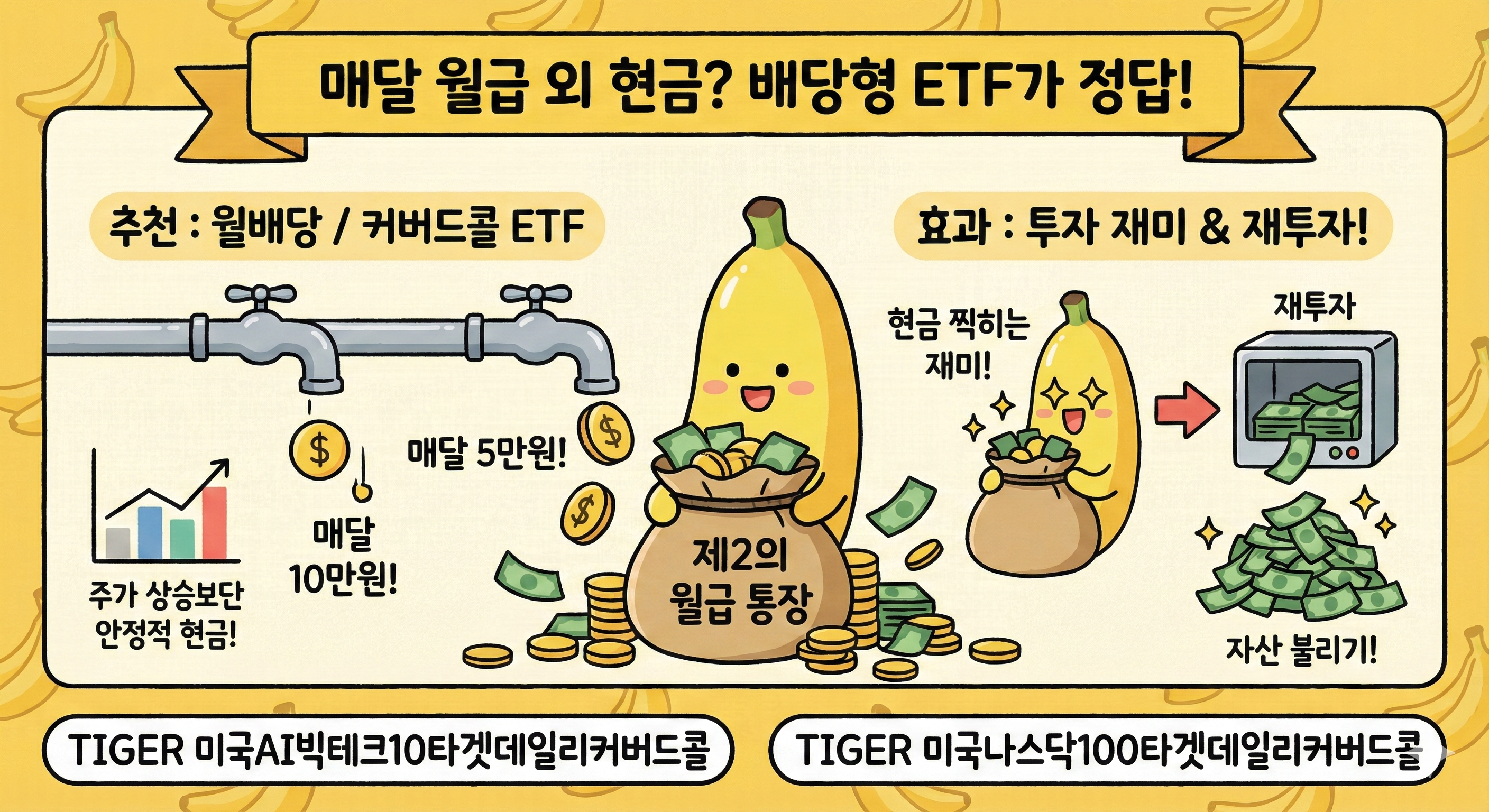 주가가 폭등할 때는 일반 ETF보다 덜 오를 수 있지만, 주가가 제자리걸음이거나 조금 떨어질 때도 꼬박꼬박 높은 배당을 줄 수 있어.