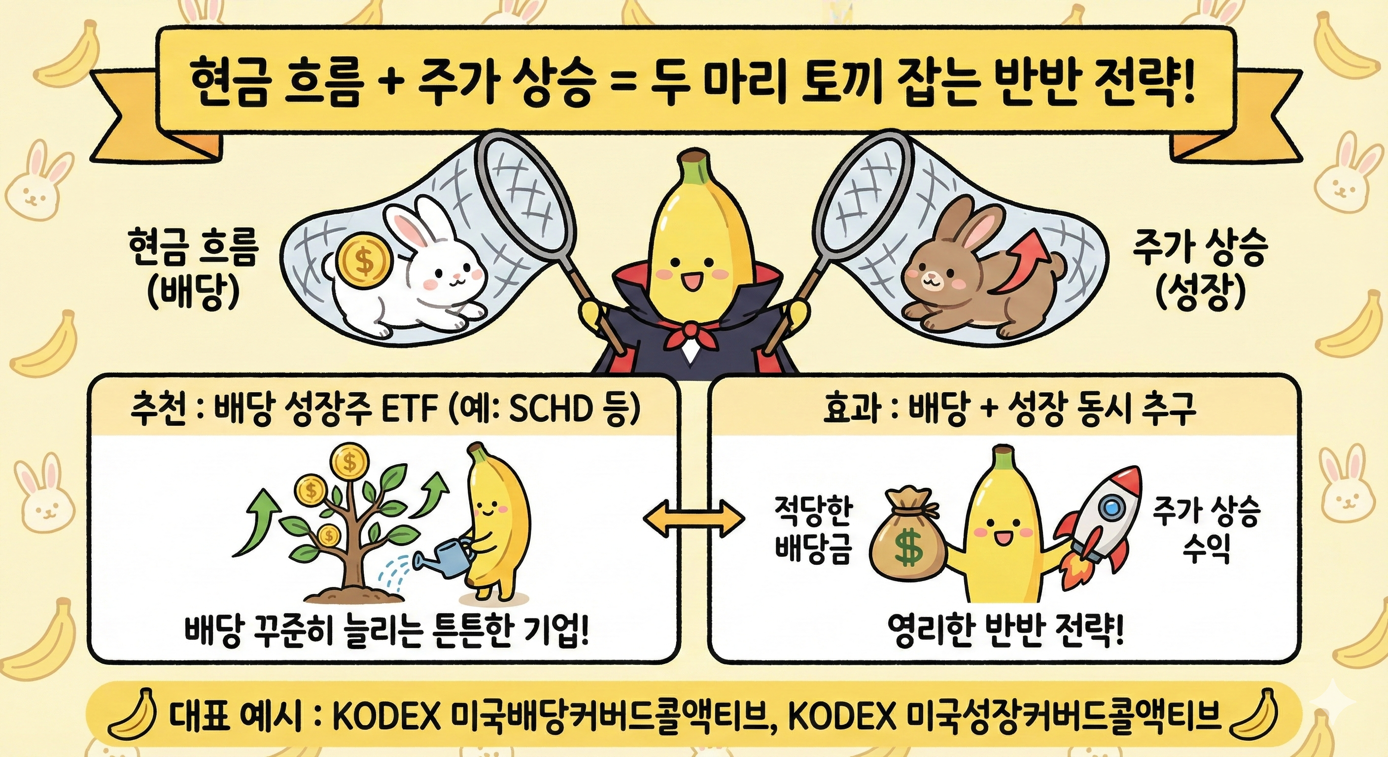 마지막으로 이런 방법도 있어. 만약 네가 매달 들어오는 현금 흐름도 놓치기 싫고, 나중에 주가가 올라서 얻는 큰 수익도 포기 못 하겠다면? 그럴 땐 두 마리 토끼를 다 잡는 '반반 전략'을 써보는 거야.