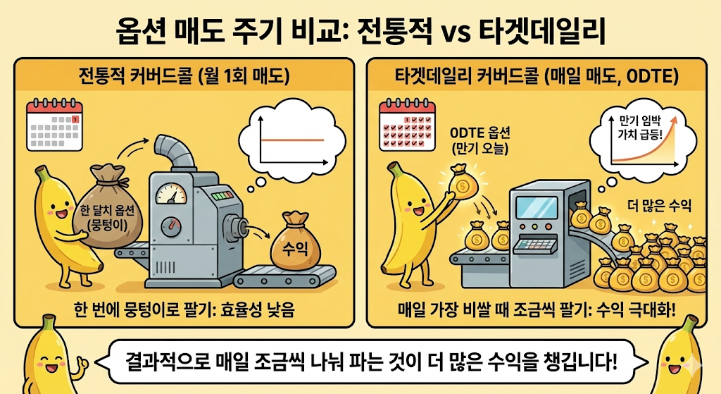 먼저 가장 큰 이유는 옵션을 파는 주기에 있어. 보통 '합성 상품' 같은 전통적인 커버드콜은 한 달치 옵션을 한꺼번에 뭉텅이로 팔아버리지만, '타겟데일리'는 매일매일 만기가 딱 하루 남은 '0DTE'(만기가 오늘인 옵션) 옵션을 조금씩 나눠서 팔거든. 옵션은 만기가 가까워질수록 그 가치가 급격히 비싸지는 특징이 있는데, 100% 비중으로 한 달에 한 번 파는 것보다 비중은 10%라도 매일매일 가장 비싼 시점에 20번 넘게 나눠 파는 것이 결과적으로 더 많은 수익을 챙길 수 있게 되는 거지.