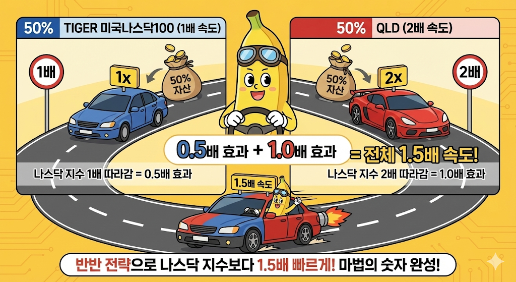 우리가 TIGER 미국나스닥100과 QLD를 반반씩 섞는다는 건 말이야, 쉽게 말해서 내 돈의 절반은 1배 속도로 가는 차에 태우고 나머지 절반은 2배 속도로 달리는 차에 나눠 태운다고 생각하면 되는데, 이걸 수학적으로 풀어보면 아주 명확하게 '1.5배'라는 마법의 숫자가 나오게 돼. 전체 자산의 50%가 나스닥 지수를 1배로 따라가서 얻는 0.5배의 효과와 나머지 50%가 2배로 따라가서 얻는 1.0배의 효과를 더하면, 내 전체 계좌는 나스닥 지수보다 1.5배 빠른 속도로 움직이게 되는 원리지.