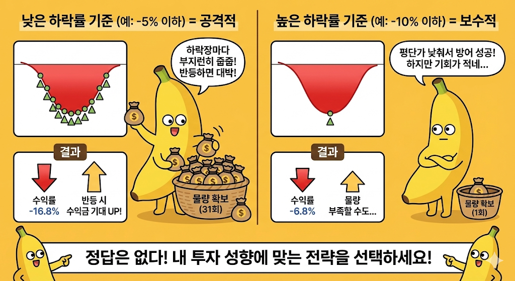 결과를 보면 확실히 하락률 기준을 높게 잡을수록 매수 기회는 적지만 평단가가 낮아져서 수익률 방어에는 유리했어. 예를 들어 -10% 전략은 단 한 번만 매수했는데도 수익률이 -6.8%로 가장 선방했거든. 반면 -5% 전략은 하락장에서 꾸준히 물량을 쌓다 보니 수익률은 -16.8%로 더 낮게 나왔지.